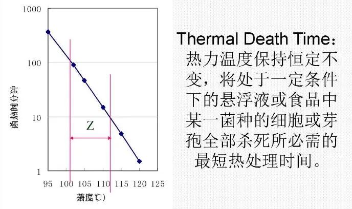 2.3 D 值 (Decimal reduction time) D 值的定义: 特定温度下,使微生物减少至原始菌数 1/10 时所需的保温时间。 D65= 1min 的含义是 65 ℃ 时,灭菌时间每延长一分钟,微生物数量减少为1D (减少90%)。延长两分钟微生物数量减少为 2D (减少 99%): 1D= 90% 减少= 1 个指数下降 2D= 99% 减少= 2 个指数下降 3D= 99.9% 减少= 3 个指数下降 4D= 99.99% 减少= 4 个指数下降 2.3 Z 值 Z 值的定义:Z 值是指使某一种微生物的 D 值下降一个对数单位时,灭菌温度应升高的度数, 其单位为 ℃ 。 Z 值越大,微生物对温度变化的敏感性越弱;Z 值的作用是转换计算不同温度下的杀灭微生物的效果; 如果某种微生物 Z 值为 10℃ ,并且 D65 = 50 秒, 这就意味着: D75 = 5 秒 也就是可以通俗的理解为:提高 1Z 值的杀菌温度的同时,将杀菌时间减少至原来的 1/10,对这种微生物的杀菌效果是没有变化的;反过来说,降低 1Z 值的杀菌温度,那就要将杀菌时间增加 10 倍才能得到等效的杀菌效果。 2.4 F 值 在基准温度中杀死一定数量对象微生物所需要热处理的时间(min),即该微生物的杀菌值。 F0 值的定义:在湿热灭菌中,参比温度规定为 121℃,以嗜热脂肪芽孢杆菌为生物指示剂的Z值为 10℃,即 F0 值为一定杀菌温度 T 下 Z 值为 10℃ 时所产生的灭菌效率与 121℃、Z 值为 10℃ 所产生的灭菌效率相同时所相当的时间Min。也就是说 F0 值是将各种灭菌温度的灭菌效果转换为 121℃ 灭菌的等效值。 F0 值的计算公式 对于热压灭菌法,参比温度定为 121℃,参比微生物选择嗜热脂肪芽胞杆菌,其 Z 值为 10℃,此时得到的 F 值称为 F0 值。用公式表示为: “T” 是产品灭菌的温度 “Δt” 温度 T 下测试的间隔时间